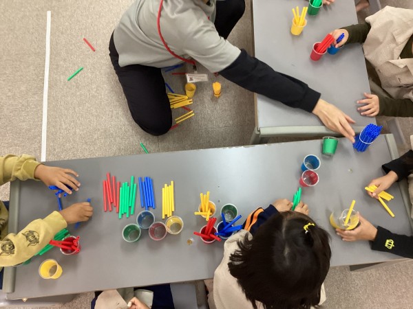 赤いコップには赤い色、黄色いコップには黄色など色分けをしたり、赤に2本、青に3本、黄色に1本など数と色を合わせる遊びです。