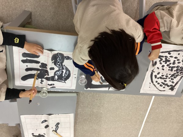 力を入れると太い線、力を緩めると細い線の練習をしたあとは、好きな絵を描いたり塗ったりとお習字も楽しくできました♪