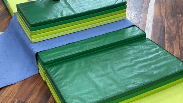 厚みのあるマットを使用して階段を上り下りする動き。