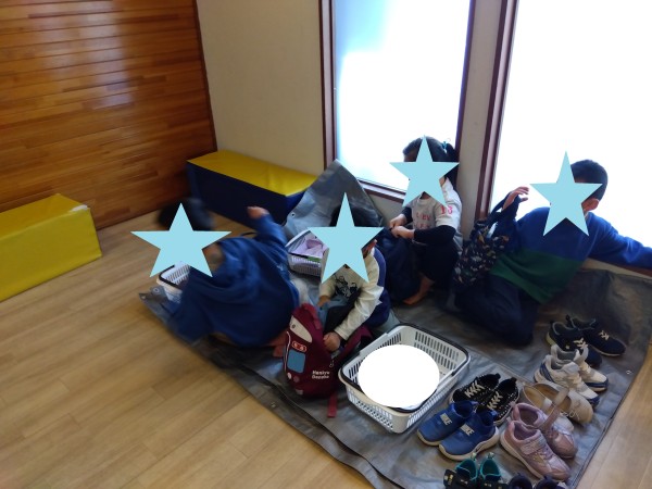 かばんにいれて、靴も履き、呼ばれるまでシートの上で待っていました。いつもと違うので緊張していた様子もみられましたが、声をかけ合いながら待っていました。