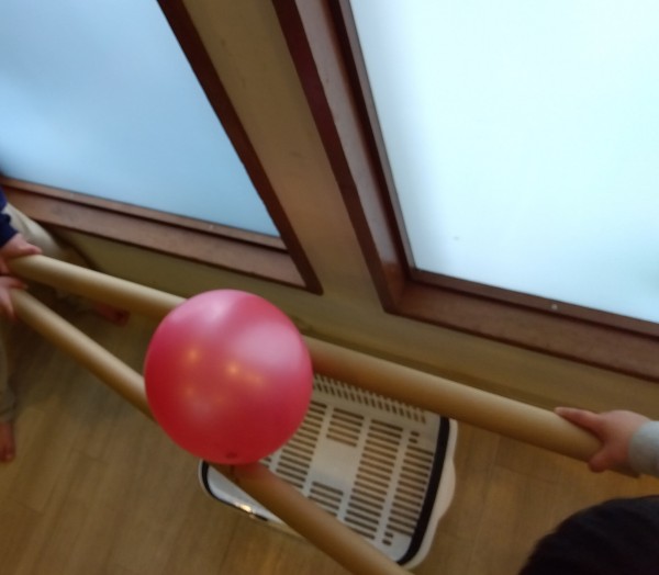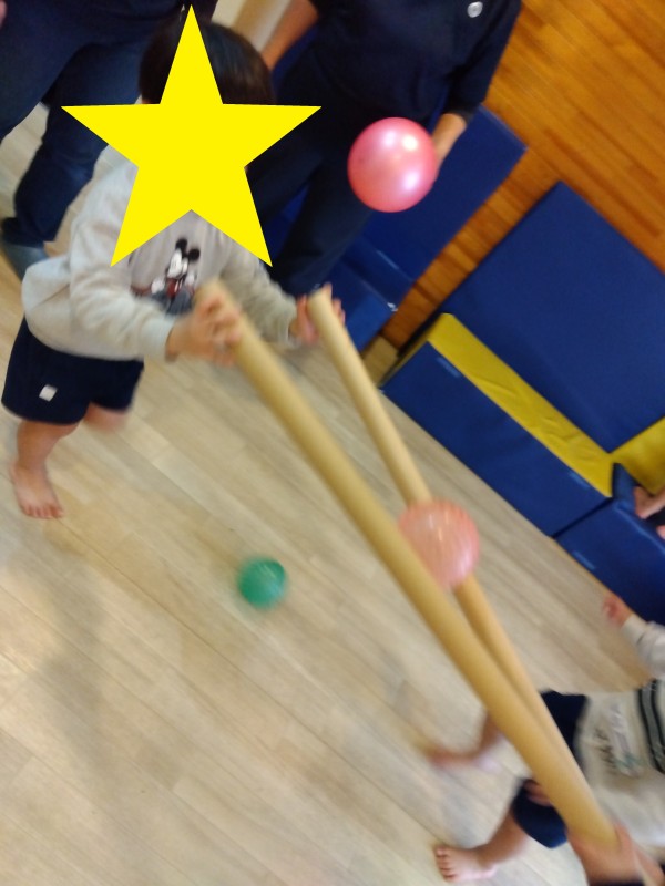 紙管の上にボールをのせて…